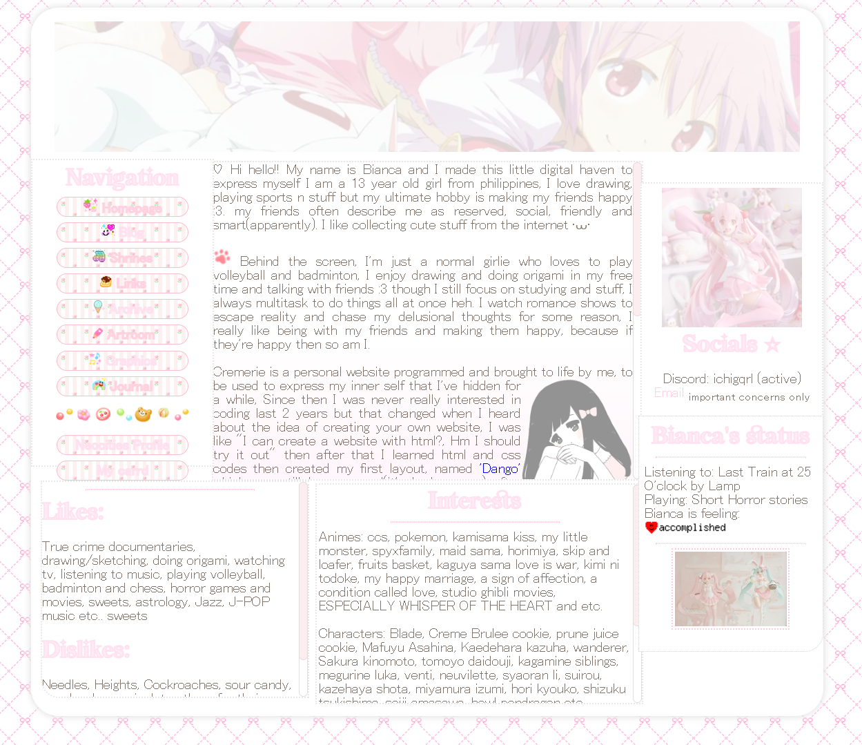 Hello and welcome to my shoujo cove! You've stumbled upon SHOUJOLOVE! (*^_^*) I go by bianca online, shoujolove serves as my little space on the internet to be myself! feel free to explore my digital space ~ "I know you love me" ㅤ♡
